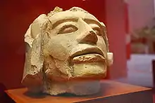 Chronology studies at Tajín and nearby sites show that the area has been occupied at least since 5600 BCE and show how nomadic hunters and gatherers eventually became sedentary farmers, building more complex societies prior to the rise of the city of El Tajin.[16] The pace of this societal progression became more rapid with the rise of the neighboring Olmec civilization around 1150 BCE, although the Olmecs were never here in great numbers.[17] It is unclear who built the city. Some argue in favor of the Totonacs and the Xapaneca; however, there is a significant amount of evidence that the area was populated by the Huastec at the time the settlement was founded in the 1st century CE[16][18] Monumental construction started soon after and by 600 CE, El Tajín was a city.[6][19] The rapid rise of Tajin was due to its strategic position along the old Mesoamerican trade routes. It controlled the flow of commodities, both exports such as vanilla and imports from other locations in what is now Mexico and Central America. From the early centuries, objects from Teotihuacan are abundant.[19]