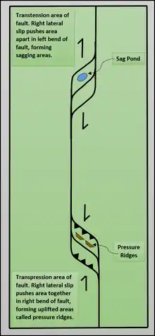 The central subdivision is approximately 48–53 km long.[2][5] This area exhibits transpressive and transtensive geomorphological features.[1][2] Sag ponds (releasing basins) form when the right lateral fault bends to the left causing the crust to extend (transtensive).[1][2] Pressure ridges form when the right-lateral fault bends to the right causing the crust to compress (transpressive).[1][2] A bedrock scarp with an east-facing slope shows vertical displacement along this part of the fault.[1][2] The scarp has a slope of 18-24° and maximum height of 85 m.[2] Tectonic shortening appears to have changed direction from WSW-ENE to W-E during the Pleistocene, altering the kinematics to the present transpressive/transtensive system from a mainly transcurrent one.[1]