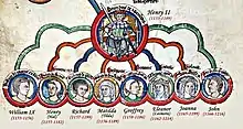 By all accounts, Eleanor's father ensured that she had the best possible education.[8] Eleanor came to learn arithmetic, the constellations, and history.[4] She also learned domestic skills such as household management and the needle arts of embroidery, needlepoint, sewing, spinning, and weaving.[4] Eleanor developed skills in conversation, dancing, games such as backgammon, checkers, and chess, playing the harp, and singing.[4] Although her native tongue was Poitevin, she was taught to read and speak Latin, was well versed in music and literature, and schooled in riding, hawking, and hunting.[9] Eleanor was extroverted, lively, intelligent, and strong-willed. Her four-year-old brother William Aigret and their mother died at the castle of Talmont on Aquitaine's Atlantic coast in the spring of 1130. Eleanor became the heir presumptive to her father's domains. The Duchy of Aquitaine was the largest and richest province of France. Poitou, where Eleanor spent most of her childhood, and Aquitaine together was almost one-third the size of modern France. Eleanor had only one other legitimate sibling, a younger sister named Aelith (also called Petronilla). Her half-brother Joscelin was acknowledged by William X as a son, but not as his heir. The notion that she had another half-brother, William, has been discredited.[10] Later, during the first four years of Henry II's reign, her siblings joined Eleanor's royal household.