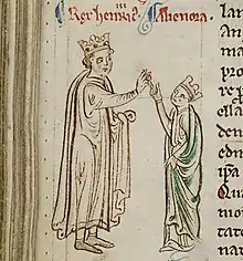 Eleanor was married to King Henry III of England on 14 January 1236.[5] She had never seen him prior to the wedding at Canterbury Cathedral and had never set foot in his kingdom.[6] Edmund Rich, Archbishop of Canterbury, officiated. She was dressed in a shimmering golden dress that fitted tightly at the waist and flared out to wide pleats at her feet. The sleeves were long and lined with ermine.[7] After riding to London the same day where a procession of citizens greeted the bridal pair, Eleanor was crowned queen consort of England in a ceremony at Westminster Abbey which was followed by a magnificent banquet with the entire nobility in full attendance.[8] Her love for her husband grew significantly from 1236 onward.