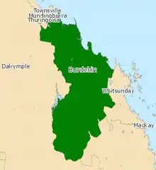 Burdekin is an electoral district in the Legislative Assembly of Queensland in the state of Queensland, Australia. Centred on the Ayr–Home Hill region, the electorate also includes some of Townsville's southern semi-rural localities as well as the coal-mining town of Collinsville. The Burdekin River flows through part of the electorate.[1]
