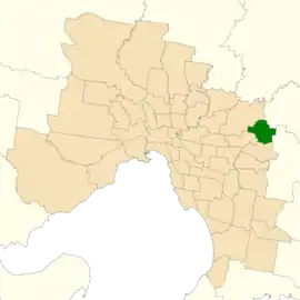 It largely covers the area of the abolished district of Kilsyth, covering outer eastern suburbs in Melbourne. It includes the suburbs of Croydon, Mooroolbark, Ringwood North, Kilsyth and Bayswater North.[2]