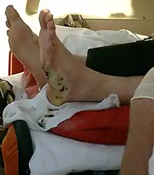 | Lightning injury caused by a nearby lightning strike. The slight branching redness (sometimes called a Lichtenberg figure) travelling up the leg was caused by the effects of current. | |