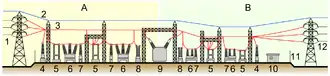 Former high-voltage substation in Stuttgart, Germany, now 110 kV switching station. The 220 kV level is eliminated for grid simplification.