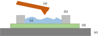 EC-AFM has various applications, where monitoring the electrode surface during electrochemical reactions leads to interesting results. Among the applications, the studies on battery and electrode corrosion in acid environment are widely spread. Concerning batteries, studies on lead–acid battery pointed out the change in the morphology during the reduction/oxidation cycles in a CV, when an acid electrolyted is used.[6][7] Different corrosion effects are widely considered for the applications of EC-AFM. Different phenomena are studies, from pitting corrosion of steel,[8] to crystal dissolution.[9] Highly oriented pyrolytic graphite (HOPG) is widely employed as an electrode for EC-AFM. In fact, various surface phenomena are studied, from the application to lithium batteries[10] to anion intercalation leading to blister formation on the electrode surface.[11] A rather interesting application is the EC-AFM Dip pen nanolithography.[12] Recently, SPM based lithography gained attention due to its simplicity and precise control the structure and location. A new development of this technique is the dip pen nanolithography (DPN), which uses the AFM technique to deliver organic molecules on different substrates, as gold. Using EC-AFM allows to fabricate metal and semiconductor nanostructures on the WE, gaining high thermal stability and a higher chemical diversity. Finally, it is possible to perform and study the electrodeposition of different materials on electrodes, from metals (i.e. copper[13]) to polymers, such as polyaniline (PANI).[14][15]