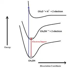 In an EI ion source, electrons are produced through thermionic emission by heating a wire filament that has electric current running through it. The kinetic energy of the bombarding electrons should have higher energy than the ionization energy of the sample molecule. The electrons are accelerated to 70 eV in the region between the filament and the entrance to the ion source block. The sample under investigation which contains the neutral molecules is introduced to the ion source in a perpendicular orientation to the electron beam. Close passage of highly energetic electrons in low pressure (ca. 10−5 to 10−6 torr) causes large fluctuations in the electric field around the neutral molecules and induces ionization and fragmentation.[11] The fragmentation in electron ionization can be described using Born Oppenheimer potential curves as in the diagram. The red arrow shows the electron impact energy which is enough to remove an electron from the analyte and form a molecular ion from non- dissociative results. Due to the higher energy supplied by 70 eV electrons other than the molecular ion, several other bond dissociation reactions can be seen as dissociative results, shown by the blue arrow in the diagram. These ions are known as second-generation product ions. The radical cation products are then directed towards the mass analyzer by a repeller electrode. The ionization process often follows predictable cleavage reactions that give rise to fragment ions which, following detection and signal processing, convey structural information about the analyte.