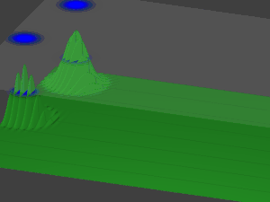 The green plane is the x-y-plane, where two (non-interacting) electron wave-packets meet. The vertical direction shows the real part of . The semi-transparent white plane in the top shows the density of detection probability, i.e., , as blue spots. The blue in the middle is the same again.