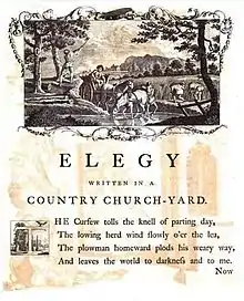 Elegy Written in a Country Churchyard is a poem by Thomas Gray, completed in 1750 and first published in 1751.[1] The poem's origins are unknown, but it was partly inspired by Gray's thoughts following the death of the poet Richard West in 1742. Originally titled Stanzas Wrote in a Country Church-Yard, the poem was completed when Gray was living near St Giles' parish church at Stoke Poges. It was sent to his friend Horace Walpole, who popularised the poem among London literary circles. Gray was eventually forced to publish the work on 15 February 1751 in order to preempt a magazine publisher from printing an unlicensed copy of the poem.