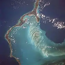 Eleuthera (/ɪˈljuːθərə/) refers both to a single island in the archipelagic state of The Commonwealth of the Bahamas and to its associated group of smaller islands.[1] Eleuthera forms a part of the Great Bahama Bank.[1] The island of Eleuthera incorporates the smaller Harbour Island. "Eleuthera" derives from the feminine form of the Greek adjective ἐλεύθερος (eleútheros), meaning "free".[2] Known in the 17th century as Cigateo, it lies 80 km (50 miles) east of Nassau. It is long and thin—180 km (110 miles) long and in places little more than 1.6 km (1.0 mile) wide. Its eastern side faces the Atlantic Ocean, and its western side faces the Great Bahama Bank. The topography of the island varies from wide rolling pink sand beaches to large outcrops of ancient coral reefs, and its population is approximately 11,000. The principal economy of the island is tourism.
