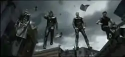 Set with Lara Croft along with Bono and a rescue of the Edge from his "evil twin brother" (the Edge has been inserted into footage from Lara Croft: Tomb Raider), the video begins with Bono receiving a phone call from his evil counterpart known as "evil Bono", who states that they have captured The Edge and demands for "the key". The evil counterpart announces that Bono himself is surrounded before ending with the words "not even Lara Croft can help you now", which puzzles Bono. After escaping several of the "evil U2's" murder attempts, the band reunites and performs a "rock-off" against their evil counterparts, which ends with the "good U2" emerging victorious. The video ends with the "good U2" walking with Lara from the scene to a place with levitating cars and a pachyderm, ending with a Boeing 747-400 flying overhead before fading to black (the plane is also seen at the very beginning of the video).