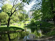 This entrance was expected to replace the need for Elisenberg Station, and was located in the middle of the Oslo Tunnel, between Nationaltheatret and Skøyen.[18] Oslo Byes Vel and the Conservative, Red and Centre parties opposed the construction of the entrance, arguing that it would ruin the south-western corner of the Palace Park.[19] The Conservative Party proposed building it further south, across Henrik Ibsens gate, either in Hansteens gate or in Parkveien near Oslo Commerce School, while the others wanted to open Elisenberg Station for traffic.[20]