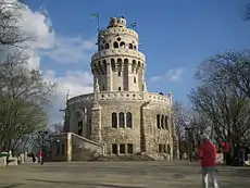The Elizabeth Lookout (Hungarian: Erzsébet-kilátó) is a historic lookout tower on János Hill (Hungarian: János-hegy) above Budapest. Built in 1911, the tower was named after Empress Elisabeth, wife of Emperor Franz Joseph I. Frigyes Schulek was the architect. The tower is near Budapest's District XII, and may be reached from the Széll Kálmán tér of Budapest. At first, there was a low wooden platform, which was demolished. After that, Frederick Gluck had an idea, to raise a stone tower and then he started gathering investors for the project. Budapest[1] city approved the project in 1907 and Schulek Frederick received the commission to build the tower. The construction started in 1908 and Paul Kluczinger was the construction manager. The tower was built from haraszti limestone. The lookout named after Queen Elizabeth, who visited the mountain in 1882.[2]