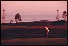 The South Ellwood Offshore field is entirely beneath the Pacific Ocean, about two miles (3.2 km) from the main onshore oil field. It is entirely within the State Tidelands zone, which encompasses areas within three nautical miles (5.6 km) of shore. These regions are subject to state, rather than Federal regulation. The last production from this field was from Platform Holly, which is in 211 feet (64 m) of water, about two miles (3.2 km) from the coast at Coal Oil Point and has been shut down.[3] Numerous directionally-drilled oil wells originate at the platform, and several pipelines connect the platform to an onshore oil processing facility adjacent to the Sandpiper Golf Course.[4]