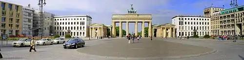 The new 180 million euro Embassy building, conceptualized in 1996 by Moore Ruble Yudell, has its main entrance facing north towards the famous Pariser Platz. Its eastern side abuts an existing bank building, and the west side of the land faces Ebertstraße. The south side also faces a street, towards the German Holocaust memorial. Pariser Platz is most famous for the Brandenburg Gate at its western entrance. The small Haus Sommer building, also housing a bank, is in between the northwest corner of the new U.S. Embassy and the Brandenburg Gate. Close to the Pariser Platz and the new embassy is the Reichstag building, home to the German Bundestag. Located on Pariser Platz, or on the same city blocks that surround Pariser Platz are the French and British embassies as well as the Hotel Adlon. With the exception of the Brandenburg gate, which was heavily damaged in World War II, all other former structures that surrounded Pariser Platz were destroyed during the war, or were demolished by the East German government by about 1960. From 1960 through German Reunification in 1990, Pariser Platz held only open fields on both sides of the major boulevard Unter den Linden. In 1992, the governments decided that a new American embassy building would be built on the site, and in 1993 a memorial announcing these plans was placed in the open field.