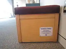 If possible, exhibition galleries, hallways, lobbies, and offices are functionally decorated with hinged-lid benches that contain an Evacu-Trac Emergency Evacuation Chair. In the event of an emergency, elevators are not safe and any disabled staff member or visitor will need to be able to evacuate down the stairs. Strategically placed near exits and spaced along the designated evacuation routes, the collapsible chair has a low handle height, is lightweight, and has a fail-safe brake so that anyone can assist this person.[15]
