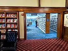 The main feature on the façade is a 4-foot-tall clock with Roman Numerals. Inside, the leaded glass window of the Archangel Michael-1892 by Otto Heinigke (1851–1915) and Owen J. Bowen (1873-1967) dominate the main reading room. The original collection of 1,500 reference books took up the stacks until a modernization in 1945 removed the public barrier. Until then librarians handled book requests and fetched the tomes for review. This modernization left intact the reading alcoves (where the fireplaces were) and others were added. Prior to WWII, the only improvements were to the lights, which were electrified in 1913. There was an additional outbuilding which served as a home for the librarian and also a number of groundskeepers, it fell victim to a fire in 1945.