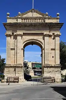 De Rohan sought to win the respect of the people, and he became a popular Grand Master. On 21 June 1777, he elevated the village of Żebbuġ to the status of city, naming it Città Rohan. An archway commemorating this event was constructed in 1798.[2] The coat of arms of Żebbuġ contains the arms of the House of Rohan, in honour of the Grand Master.[3]