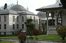 The third courtyard of the Topkapı Palace was surrounded by the Imperial Treasury, the Pavilion of the Holy Mantle, and the buildings of the Palace School, which educated the top tier of students from Enderun as well as princes of the House of Osman. There were seven halls or grades within the Palace School, and within each hall there were 12 teachers responsible for the students' mental and academic development. Students wore special uniforms designated by their achievement level,[9] and Miller indicated that additional buildings included the library, mosque, music conservatories, dormitories, and baths.[10]