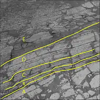 The picture to the right shows changes in the color of the bedrock layers. The layer "A" is closer to the rover and higher than the layers "B" to "E". Texture and rock chemistry also differed with depth. Thus scientists infer that the age of these layers is following a similar pattern, with the higher layers being younger than the lower layers.[4]