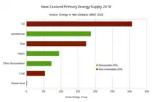 Despite abundant natural resources and a relatively small population, New Zealand is a net importer of energy, in the form of petroleum products. The ratio of non-renewable and renewable energy sources was fairly consistent from 1975 to 2008, with about 70 percent of primary energy supply coming from hydrocarbon fuels. This ratio decreased to about 60 percent in 2018.[1] The proportion of non-renewable energy varies annually, depending on water flows into hydro-electricity lakes and demand for energy.[2] In 2018, approximately 60% of primary energy was from non-renewable hydrocarbon fuels and 40% was from renewable sources.[1] In 2007 energy consumption per capita was 120 gigajoules. Per capita energy consumption had increased 8 per cent since 1998. New Zealand uses more energy per capita than 17 of 30 OECD countries.[3] New Zealand is one of 13 OECD countries that does not operate nuclear power stations.