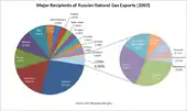 Russia has identified the gas sector as being of key strategic importance. The share of natural gas as a primary energy source is remarkably high compared to the rest of world. Russia has the world biggest natural gas reserves, mainly owned and operated by the Russian monopoly Gazprom, which produces 94% of Russia's natural gas production. In global context Gazprom holds 25% of the world's known gas reserves and produces 16% of global output.[7] In 2011, Russia was the world's biggest natural gas producer with 677 billion cubic metres (23.9 trillion cubic feet) which accounted 20.0% of global natural gas production. It is also the biggest gas exporter with 196 billion cubic metres (6.9 trillion cubic feet).[8] The main export markets of Russian natural gas are the European Union and the CIS. Russia supplies a quarter of the EU gas consumption, mainly via transit through Ukraine (Soyuz, Brotherhood) and Belarus (Yamal-Europe pipeline). The main importers are Germany (where links were developed as a result of Germany's Ostpolitik during the 1970s,[9] and also Ukraine, Belarus, Italy, Turkey, France and Hungary.