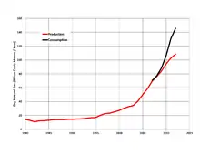Since 1996 Chinese oil production has slowly and continuously decreased, while demand and imports have steadily increased.[4] Future Chinese oil reserves (such as the Tarim basin) are difficult to extract, requiring specific technologies as well as the construction of pipelines thousands of kilometers long. As a result, such reserves would be very difficult to develop and not cost-effective, given current market prices.[5][6]