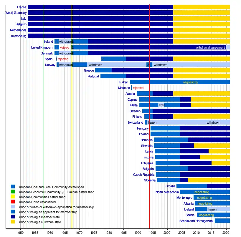 The reasons for the first member states to apply, and for them to be accepted, were primarily economic while the second enlargement was more political. The southern Mediterranean countries had just emerged from dictatorships and wanted to secure their democratic systems through the EEC, while the EEC wanted to ensure the same thing and that their southern neighbours were stable and aligned to NATO.[14] These two principal forces, economic gain and political security, have been behind enlargements since. However, with the recent large enlargements in 2004, public opinion in Europe has turned against further expansion.[15]