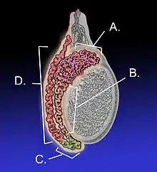 ![]() Adult human testicle with epididymis: A. Head of epididymis, B. Body of epididymis, C. Tail of epididymis, and D. Vas deferens | |