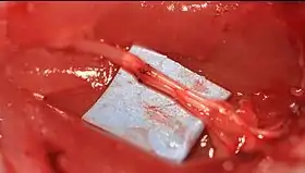 Detailed descriptions of epineural repair focus on removal of scar and apposition of healthy tissue.[3][4] After removal of scarred nerve tissue, the nerve is freed from surrounding soft tissues and its course may be shifted to allow the free ends to meet more easily. Initial sutures are placed on opposite sides of the joint, through the epineurium and slightly into the subepineurial neural structure to anchor the two nerves together. Suturing continues 180 degrees from each initial suture. The position of the lateral sutures is reversed to expose the opposite side and sutured the same way. Glue can be used in the place of some sutures to limit scarring, resulting in better axonal growth, and speed up the surgery. If it is needed to bend the body part in any position to bring the nerve ends together, the patient is instructed to maintain this position for 10–14 days in order not to disrupt the repair.[1]