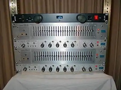 The Langevin Model EQ-251A was the first equalizer to use slide controls. It featured two passive equalization sections, a bass shelving filter, and a pass band filter. Each filter had switchable frequencies and used a 15-position slide switch to adjust cut or boost.[9] The first true graphic equalizer was the type 7080 developed by Art Davis's Cinema Engineering. It featured 6 bands with a boost or cut range of 8 dB. It used a slide switch to adjust each band in 1 dB steps. Davis's second graphic equalizer was the Altec Lansing Model 9062A EQ. In 1967 Davis developed the first 1/3 octave variable notch filter set, the Altec-Lansing "Acousta-Voice" system.[10]
