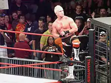 Young and ODB made their first title defense two weeks later, when they defeated Mexican America (Rosita and Sarita).[74] Young's and ODB's wedding ceremony took place on the April 12 Impact Wrestling.[75] Three days later at Lockdown, Young and ODB defeated Rosita and Sarita in a steel cage match to retain the Knockouts Tag Team Championship.[76] On May 13 at Sacrifice, Young was defeated by Crimson in a singles match.[77] Afterwards, Young took a hiatus from TNA to film his upcoming Animal Planet program.[78] During the hiatus, Young and ODB became the longest reigning Knockouts Tag Team Champions in history by surpassing The Beautiful People's reign of 141 days on July 19. Young returned to TNA on the August 30 Impact Wrestling, reuniting with ODB after her match with Madison Rayne.[79] Young made his in-ring return on November 11 at Turning Point, teaming with ODB to defeat Tara and Jesse in a non-title mixed tag team match.[80] On the following Impact Wrestling, Young was defeated by Jesse in a singles match.[81] The following week during the TNA Turkey Bowl, Young pinned Jesse in a three-way match, which also included Robbie E and forced Jesse to wear a turkey suit as part of the Thanksgiving theme. After the match, both he and ODB were ambushed by the Aces & Eights and they proceeded to injure Young by hitting his exposed ankle with a ball-peen hammer, while ODB was handcuffed outside the ring and forced to watch.[82] Young returned on the February 28, 2013, episode of Impact Wrestling, being revealed as the final member of Sting's Lethal Lockdown team and attacking their opponents, Aces & Eights.[83] On March 10 at Lockdown, Team TNA, consisting of Young, James Storm, Magnus, Samoa Joe, and Sting defeated Aces & Eights, consisting of Devon, DOC, Garett Bischoff, Knux, and Mr. Anderson in a Lethal Lockdown match, with Young pinning Knux for the win.[84]
