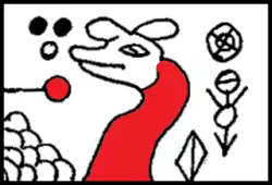In the center of the diagram is a dog's head, meaning it is a 'dog day'. The dog's body is red, meaning it's also a fire day. The combination means the ninth day of the first lunar month. At the bottom left is fog, meaning the morning will be foggy; if the fog were on the right, it would be in the evening. Above that is a red tsá jug with a handle (#27 in the table above); tsá jugs are used for alcohol, and the auspicious red color means that the drinking will be good on that day, meaning the day itself will be comparatively good. At the top left are three stars (22 above), two black and one white; a black star is dim, a white star shining. [Meaning unclear.] At top right is the Sun (18 above) crossed out in chains, meaning it will be hindered and the weather will not be good. The npʰópá (a religious implement) and the ritual tsʰintʃʰá knife, which can overcome negative forces, indicate that positive and negative forces will balance.