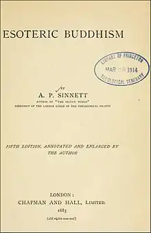 Esoteric Buddhism is a book originally published in 1883 in London; it was compiled by a member of the Theosophical Society, A. P. Sinnett.[1][2] It was one of the first books written for the purpose of explaining theosophy to the general public,[3] and was "made up of the author's correspondence with an Indian mystic."[4] This is the most significant theosophical work of the author. According to Goodrick-Clarke, it "disseminated the basic teachings of Theosophy in its new Asian cast."[5][note 1]
