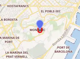 The stadium is located in the Anella Olímpica, in Montjuïc, a large hill to the southwest of the city which overlooks the harbor.