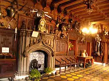 Nineteenth-century interiors could often be lavish and eclectic.[57] The origins of this style were in Scott's Abbotsford, where the author began the incorporation of actual old architectural fragments and pieces of furniture on a lavish scale (the effective beginning of 'antique' collecting in Scotland). He also initiated the treatment of new surfaces so as to resemble old ones, with new wood darkened to resemble old oak.[58] The Adam solution of a castellated exterior with a neo-classical interior was abandoned and in Baronial Revival houses this change was extended to create a synthesised Victorian style that combined elements of the Renaissance, such as plastered or rubble walls, unpainted stone fireplaces and pitch pine timberwork, with seventeenth-century style plaster ceilings. To this were added symbols of landed power and national affiliation, including displays of tartan, weaponry and stuffed animals' heads. Integrated into these traditional materials and styles were modern fittings such as sprung upholstery, gas lighting and water-closets.[59]