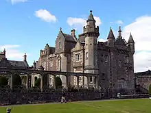 Important for the adoption of the style in the early nineteenth century was Abbotsford House, the residence of the novelist and poet, Sir Walter Scott. Re-built for him from 1816, it became a model for the modern revival of the baronial style. Common features borrowed from sixteenth- and seventeenth-century houses included battlemented gateways, crow-stepped gables, pointed turrets and machicolations. The style was popular across Scotland and was applied to relatively modest dwellings by architects such as William Burn (1789–1870), David Bryce (1803–76),[30] Edward Blore (1787–1879), Edward Calvert (c. 1847–1914) and Robert Stodart Lorimer (1864–1929).[31] The publication of Robert Billings' Baronial and Ecclesiastical Architecture of Scotland (1848–52) provided a handbook for the style[32] and the rebuilding of Balmoral Castle as a baronial palace (and subsequent adoption as a royal retreat from 1855–58) confirmed its popularity.[33] Estate house building boomed between about 1855 and the agricultural depression and Glasgow Bank crash of 1878. Construction was now dominated by patronage from nouveau riche industrialists. The decline in numbers of servants, linked to the introduction of electricity, central heating and labour-saving devices such as the vacuum cleaner, also led to changes in the scale of building. Arts and crafts designs first featured in Philip Webb's (1831–1915) Gothic design at Arisaig (1863–64). It was pursued by William Lethaby at Melsetter House, Hoy (1898) for a Birmingham industrialist.[32]
