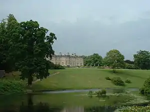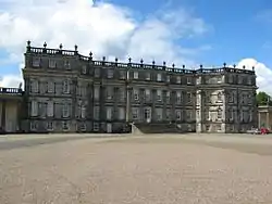 James Smith worked as a mason on Bruce's rebuilding of Holyrood Palace. In 1683 he was appointed to be Surveyor and Overseer of the Royal Works, and was responsible for maintenance of Holyrood Palace. With his father-in-law, the master mason Robert Mylne, Smith worked on Caroline Park in Edinburgh (1685), and Drumlanrig Castle (1680s). Smith's country houses followed the pattern established by William Bruce, with hipped roofs and pedimented fronts, in a plain but handsome Palladian style.[15] Hamilton Palace (1695) was fronted by giant Corinthian columns, and a pedimented entrance, although was otherwise restrained. Dalkeith Palace (1702–10) was modelled after William of Orange's palace at Het Loo in the Netherlands.[19]