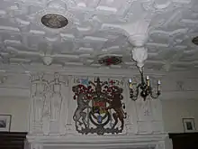 Carving and plasterwork also became a feature of estate houses. Some of the finest domestic wood carving is in the Beaton panels made for Arbroath Abbey, which were eventually moved to the dining room of Balfour House in Fife.[50][51] Carvings at Huntly Castle, rebuilt for George Gordon, 1st Marquess of Huntly in the early seventeenth century, focused on heraldic images. Their "popish" overtones led to them being damaged by an occupying Covenanter army in 1640.[52] From the seventeenth century there was elaborate use of carving in pediments and fireplaces, with heraldic arms and classical motifs. Plasterwork also began to be used, often depicting flowers and cherubs.[53] William Bruce favoured Dutch carvers for his realisation of Kinross House, where there are festoons, trophies and cornucopia around the doorways and gates. This may have included the work of Jan van Sant Voort, a Dutch carver known to have been living in Leith, who supplied Bruce with a carved heraldic overdoor in 1679 and who worked on Bruce's rebuilding of Holyrood Palace. From 1674 the London plasterers George Dunsterfield (fl. 1660–76) and John Houlbert (fl. 1674–79) worked for Bruce at Thirlestane, Berwickshire and at Holyroodhouse. Dunsterfield was also active at Balcaskie, Fife and probably at Kellie Castle.[54]