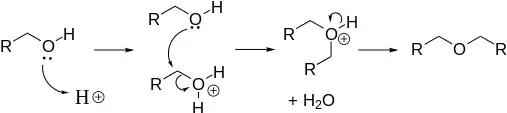 This direct nucleophilic substitution reaction requires elevated temperatures (about 125 °C). The reaction is catalyzed by acids, usually sulfuric acid. The method is effective for generating symmetrical ethers, but not unsymmetrical ethers, since either OH can be protonated, which would give a mixture of products. Diethyl ether is produced from ethanol by this method. Cyclic ethers are readily generated by this approach. Elimination reactions compete with dehydration of the alcohol: