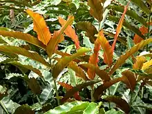 Leaves of E. fulgens displayed stronger ferrous ion-chelating ability than young leaves of Camellia sinensis.[3] Chlorogenic acid found in leaves of E. fulgens was higher in content than Lonicera japonica (Japanese honeysuckle), the commercial source.[4] Fruit and rhizome oils of E. fulgens are mainly aliphatic hydrocarbons with cyclododecane, dodecanol, and cyclotetradecane as main constituents.[5] Oils of E. fulgens and E. elatior were very different in composition despite having very similar aroma. Oils of E. fulgens consist mainly of dodecyl acetate (21.6%), an ester, and pentadecanol (14.1%) and hexadecanol (3.60%), both long-chain alcohols.[4]