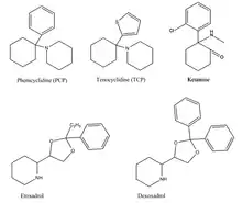 Phenicyclidine (PCP), tenocyclidine (TCP), etoxadrol and its precursor, dexoxadrol have related chemical structures.[6] These drugs all act similarly on the nervous system, acting as dissociative hallucinogens (meaning that they interfere with normal sensory signals, replacing them with hallucinations of any sensory modality) with anesthetic and analgesic properties.