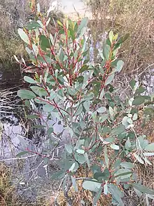 Eucalyptus aquatica is sometimes a mallee, sometimes a single-trunked tree that grows to a height of 7 m (20 ft). It has smooth greyish bark that is shed in long strips. Young plants have glossy green, elliptic to egg-shaped leaves up to 120 mm (5 in) long and 55 mm (2 in) wide. The blade of the adult leaves are dull bluish green, lance-shaped, usually curved, 50–100 mm (2–4 in) long and 20–40 mm (0.8–2 in) wide on a petiole 9–15 mm (0.4–0.6 in) long. The flower buds are arranged in groups of seven, the groups on a peduncle 3–7 mm (0.1–0.3 in) long and the individual flowers on a pedicel 1–3 mm (0.04–0.1 in) long. Both the peduncle and pedicel are up to 3 mm (0.1 in) thick. The buds are top-shaped to diamond-shaped, 6–7 mm (0.2–0.3 in) long and 3–4 mm (0.1–0.2 in) wide with a conical operculum that is about the same length and width as the flower cup. The flowers are white and the fruit is a cone-shaped or hemispherical capsule 4–7 mm (0.2–0.3 in) long and wide 5–7 mm (0.2–0.3 in) wide.[2][3][4]