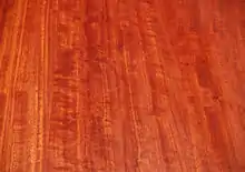 Red gum is so named for its brilliant red wood, which can range from a light pink through to almost black, depending on the age and weathering. It is somewhat brittle and is often cross-grained, making hand working difficult. Traditionally used in rot resistant applications like stumps, fence posts and sleepers, more recently it has been recognised in craft furniture for its spectacular deep red colour and typical fiddleback figure. It needs careful selection, as it tends to be quite reactive to changes in humidity (moves about a lot in service). It is quite hard, dense (about 900 kg/m3 (1,500 lb/cu yd)), can take a fine polish and carves well. It is a popular timber for wood turners, particularly if old and well-seasoned.