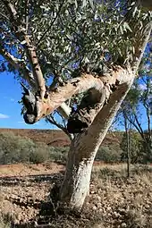 Eucalyptus camaldulensis, commonly known as the river red gum,[2] is a tree that is endemic to Australia. It has smooth white or cream-coloured bark, lance-shaped or curved adult leaves, flower buds in groups of seven or nine, white flowers and hemispherical fruit with the valves extending beyond the rim. A familiar and iconic tree, it is seen along many watercourses across inland Australia, providing shade in the extreme temperatures of central Australia.