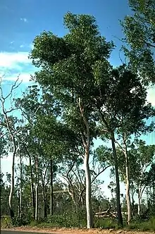 Eucalyptus hallii, commonly known as Goodwood gum,[2] is a species of small to medium-sized tree that is endemic to Queensland. It has smooth bark, lance-shaped to curved adult leaves, flower buds in groups of seven, white flower and conical fruit.