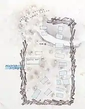 According to Lalor the stockade "was nothing more than an enclosure to keep our own men together, and was never erected with an eye to military defence."[82] However Peter FitzSimons asserts that Lalor may have downplayed the fact that the Eureka Stockade may have been intended as something of a fortress, at a time when "it was very much in his interests" to do so.[83] The construction work was overseen by Vern, who had apparently received instruction in military methods. Lynch wrote that his "military learning comprehended the whole system of warfare ... fortification was his strong point." Les Blake has noted how other descriptions of the stockade "rather contradicted" Lalor's recollection of it being a simple fence after the fall of the stockade.[84] Testimony was heard at the high treason trials for the Eureka rebels that the stockade was four to seven feet high in places, and was unable to be negotiated on horseback without being reduced.[85]