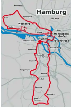 From 2005 until 2014 the first half of the course consisted of a southern loop in the direction of Lüneburg Heath in Lower Saxony, before returning to the centre of Hamburg and branching out to a western loop.[18]