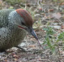 The main food of the European green woodpecker is ants of the genera Lasius and Formica[15] for which it spends much of its time foraging on the ground,[10] though other insects and small reptiles are also taken occasionally.[13] The bird's distinctive, elongated, cylindrical droppings often consist entirely of ant remains.[16] At ant nests, it probes into the ground and licks up adult ants and their larvae.[13] They have tongues that wrap to the back of their head.[18] Green woodpeckers will often forage in short grazed or mown permanent grasslands where the availability of ant nests is high.[19]