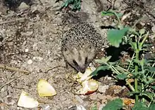 Eurasian eagle-owls (Bubo bubo) and golden eagles (Aquila chrysaetos) are the only regular avian predators of this species and may even prefer them as prey. The owl, after grabbing the hedgehog by its face, tends to skin the mammal's prickly back with its talons before consumption, resulting in several hedgehog backs being found around eagle-owl roosts and nests.[13] In Spain, reduction of European rabbit (Oryctolagus cuniculus) numbers due to rabbit haemorrhagic disease has made the European hedgehog one of the top preferred prey species for eagle-owls.[14] Elsewhere, eagle-owls often prefer these hedgehogs to any other prey species, as the hedgehog can comprise up to 23% by number and 30.7% by biomass of eagle-owl prey remains.[15][16][17] On the Swedish island of Gotland the golden eagle may take larger numbers of hedgehogs than any other prey due to an otherwise low diversity of native land mammals, although the introduction of European rabbits has shifted the eagle's prey preferences there.[18]