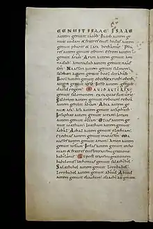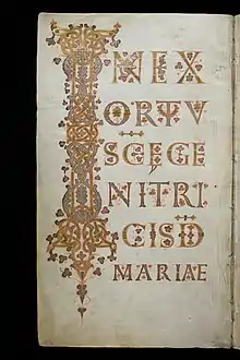 The text of the Evangelium longum was written by the monk Sintram, of whom Ekkehard says that "his fingers were admired by all the world" and that his "elegant writing’s consistency is captivating". Johannes Duft and Rudolf Schnyder likewise comment on the "admirably uniform, astonishingly steady and even hand".[13] The pages were carefully ruled with a stylus and inscribed with the so-called Hartmut minuscule that was typically used in Saint Gall in the 9th century. Abbot Hartmut (872-883) himself developed this late Carolingian minuscule in and for Saint Gall. Every sentence in the Evangelium longum begins with a golden painted capital letter resulting in a total of twenty to thirty of these capitals per page.[14] On some pages there are moreover golden initials, two of which, namely the "L" and "C" on pages 7 and 11, according to Ekkehard, were painted and gilded by Abbot Salomo himself.[15] However, on closer examination, the initials were evidently created by the same hand as the rest of the manuscript, namely by Sintram’s. As Anton von Euw remarks, Ekkehard’s comment thus has to be interpreted as an empty phrase of praise (dt. “Ruhmesfloskel”) for the benefit of Abbot Salomo.[16]